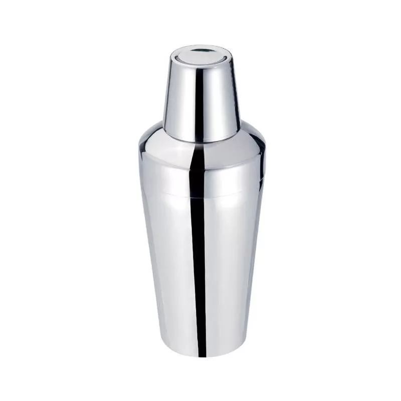 - Three-piece cocktail maker with strainer, lid, and shaker.