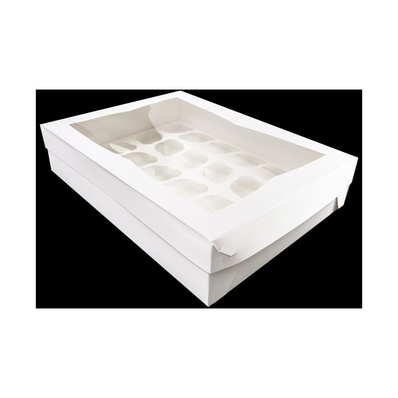 These boxes are made from high quality white milkboard - includes an insert and cover with window. Fits 24 standard cupcakes.