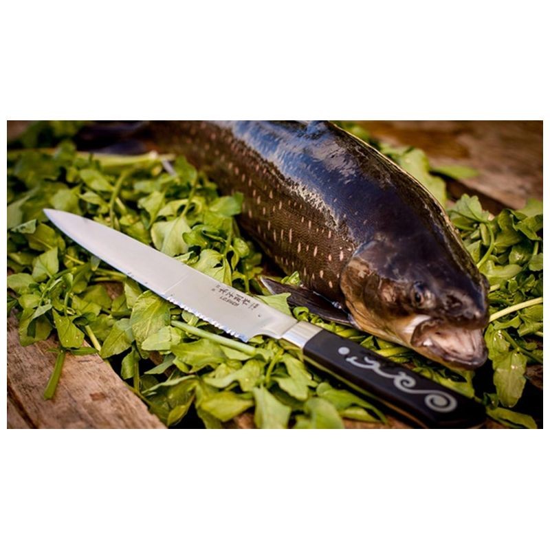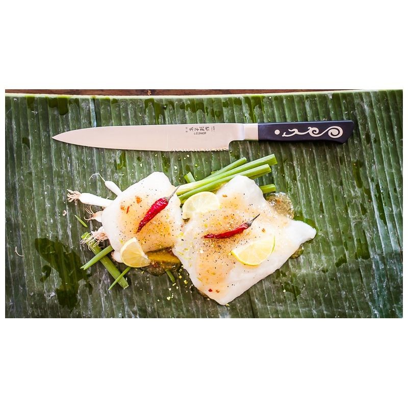 The 8″ Ryoba is a chef’s knife for the preparation/filleting of fish and carving of meat. Serrations at the heel of the blade can be used on poultry and fish.