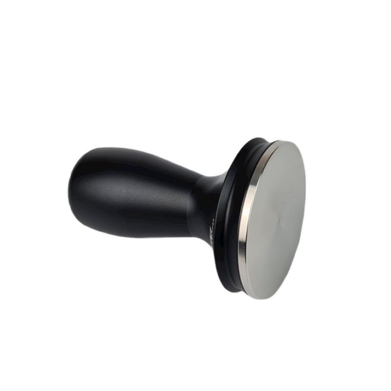 Heavy duty stainless steel coffee tamper with a matte black handle.