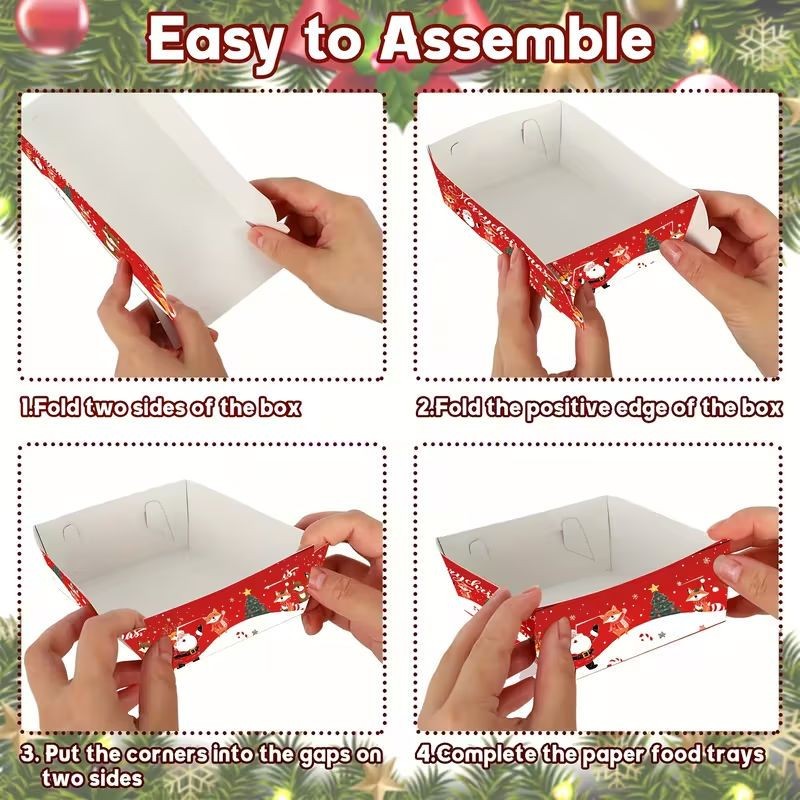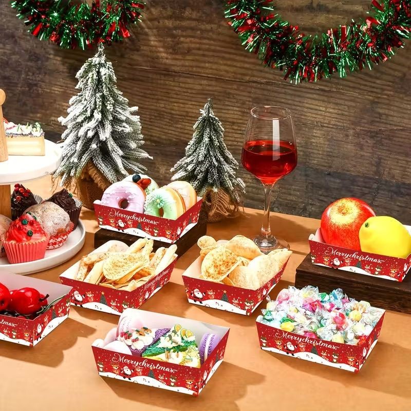 Crafted from sturdy, food-safe cardboard, these trays are lightweight yet durable, holding both dry and light snacks with ease. Their disposable design makes post-party cleanup effortless, while the festive print adds instant holiday spirit to your table setting.