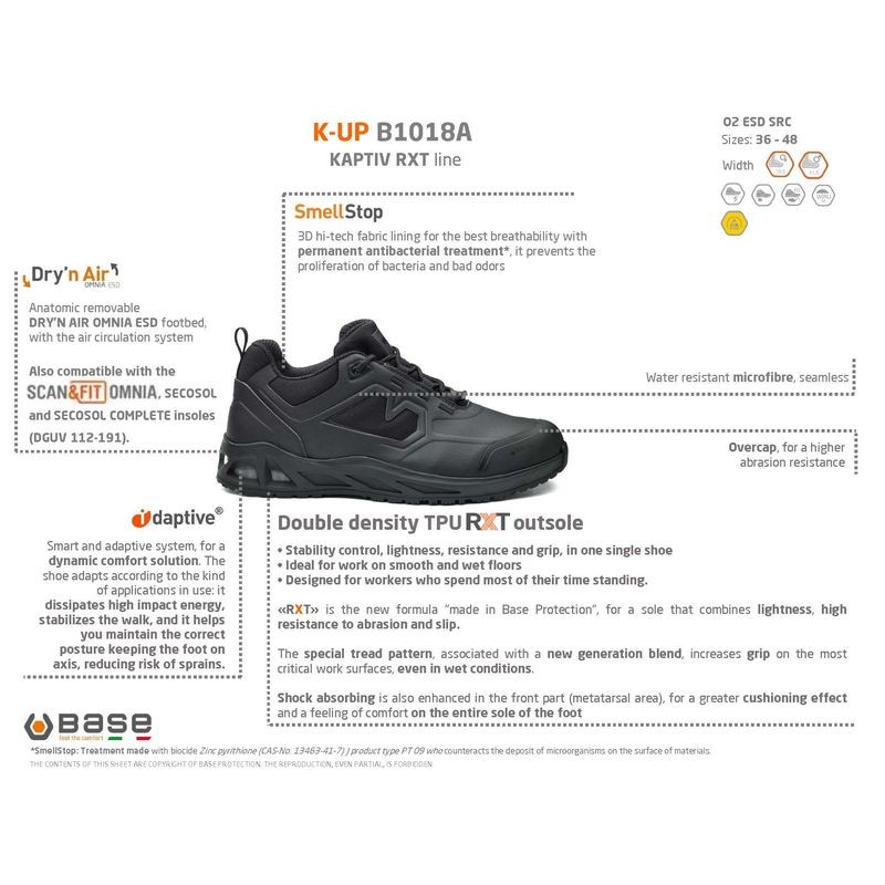 The Base K-UP Shoe is built to support your feet through demanding workdays. Its custom-fitted orthopaedic footbed meets strict European safety standards DGUV112-191, providing the foundation your feet need. Safe for ESD-sensitive environments, the shoe features i-daptive® Technology that cushions impact and keeps you comfortable when you're on your feet for hours. The durable overcap protects against wear and tear, so you can rely on this shoe to perform shift after shift without letting you down.