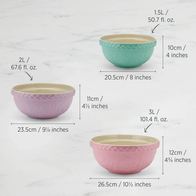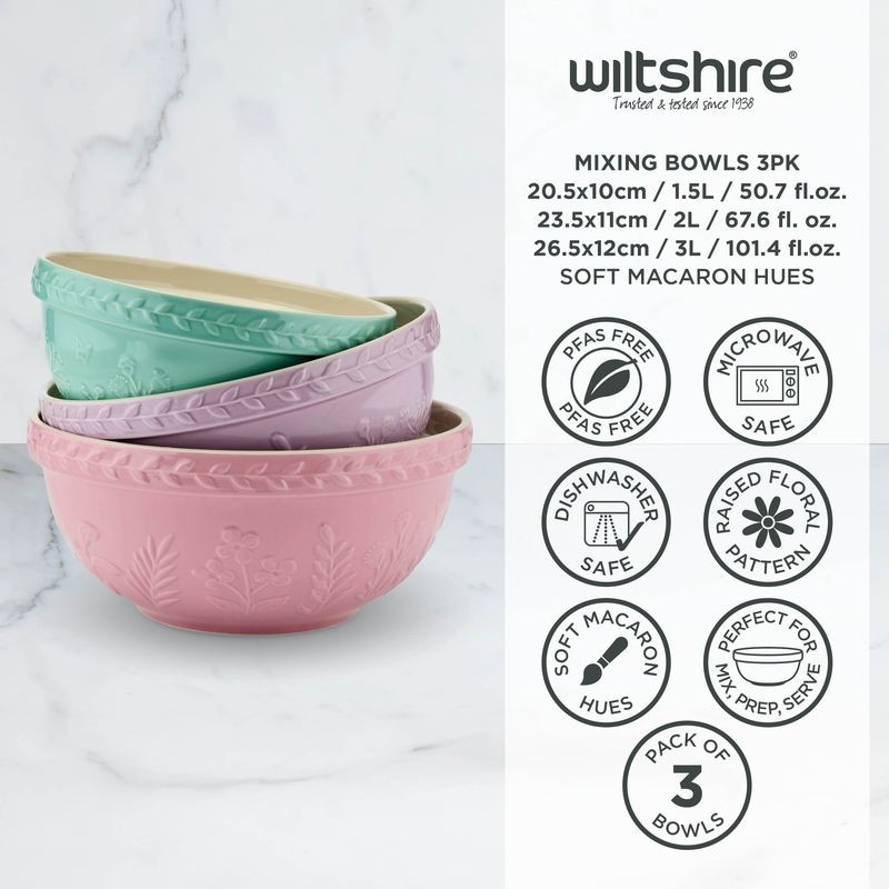 Meet the mixing bowls that bring everyday baking back to its beautiful best. Our Baking Traditions three-piece stoneware set is made for real kitchens - durable, dependable and designed to be loved for years to come. They are sturdy, microwave and dishwasher safe, and comfortable to use. Each bowl features a timeless raised floral pattern for that touch of charm and is finished in a soft macaron hue, they're as delightful to display as they are to use.