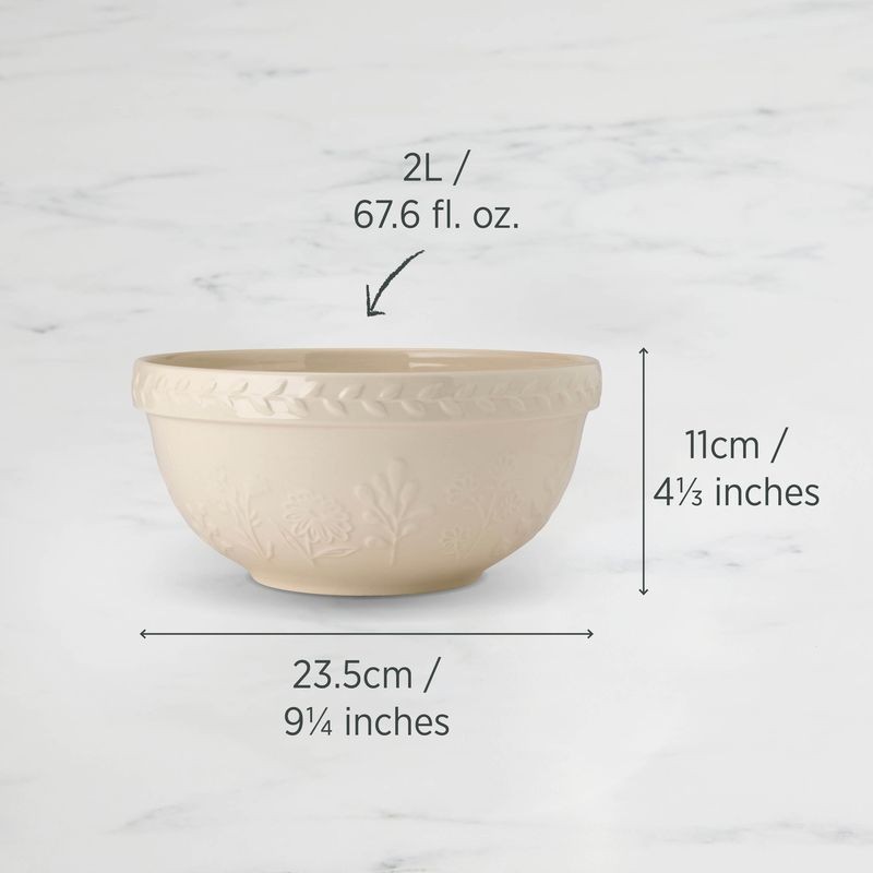 Meet the mixing bowl that bring everyday baking back to its beautiful best. Our Baking Traditions 23.5cm bowl is sturdy, microwave and dishwasher safe, and comfortable to use. Featuring a timeless raised floral pattern for that touch of charm and finished in soft vanilla, it's as delightful to display as it is to use.