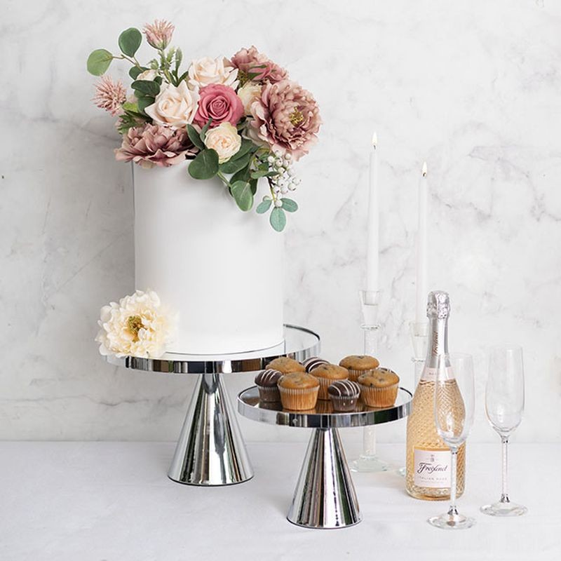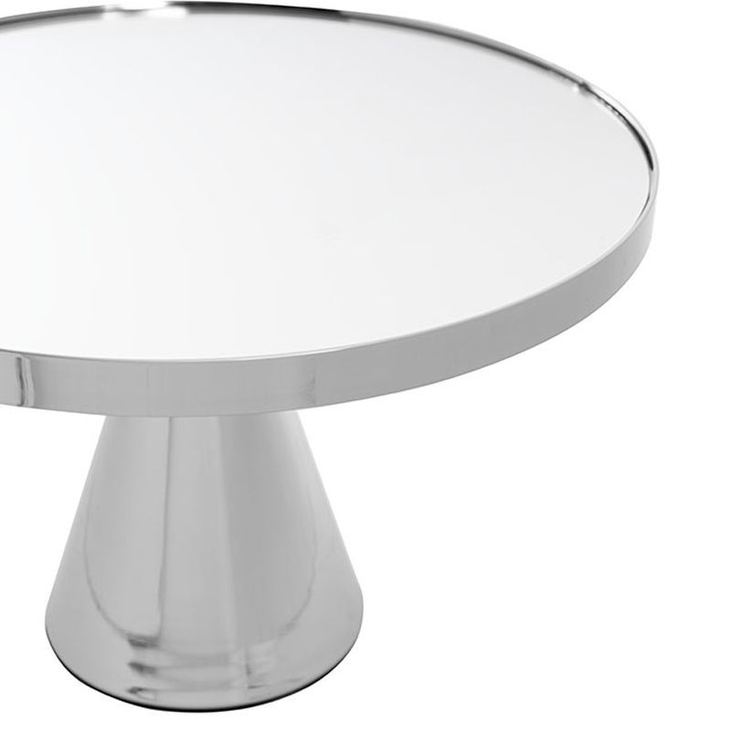 This Metal Cake Display in Silver is a subtly modern take on a classic cake stand. Made with a cone-shaped chrome silver base, the plate on this cake stand has a flat chrome edge and a glass mirror top.